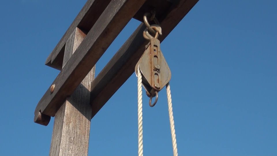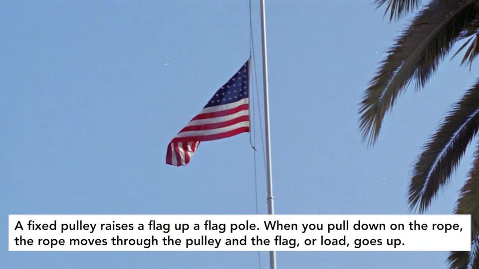 Aflagpoleworksthesameway.Aropeisloopedthroughapulleyatthetopofthepole.Toraisetheflag,youattachittoonesideoftheropeandpulldownontheotherside.Theflaggoes up!