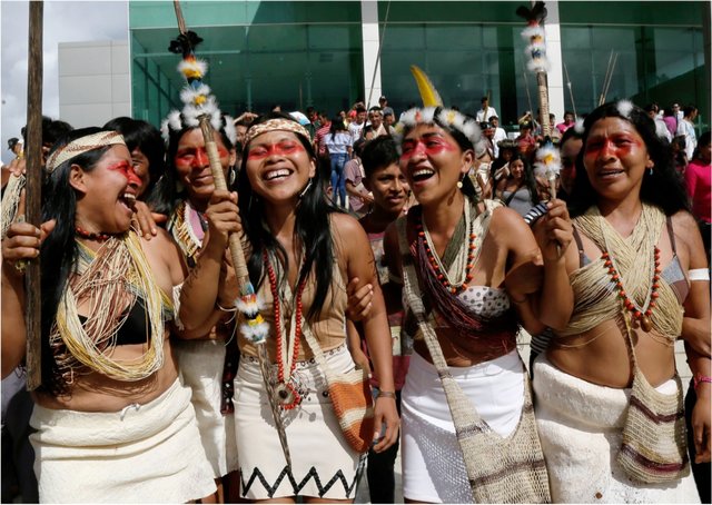 El11deabrilde2019empezóeljuicio;cientosdehuaoranimarchabanjuntosporlascallesdePuyodecaminoaltribunal.Llevabansusprendastradicionalesdehojasdepalma.Llevabanlosrostrosylosbrazosadornadosconsuspinturasdeguerra,quetambiénusabanenocasionesespeciales.Portabanlanzasyhojas selváticas.