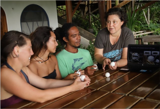 KimWilliams-Guillenexplainstovolunteershowthefakeseaturtleeggs work.