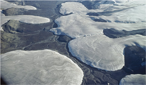Piedmontglaciers,likethisoneinCanada,formwide,roundshapesastheyspilloutontoflat areas.