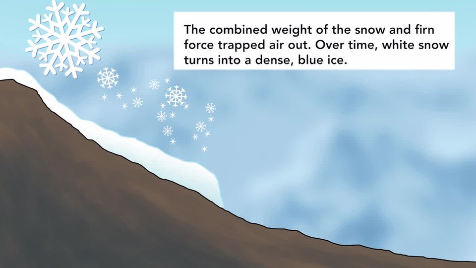 How?Closeyoureyesandimagineasinglesnowflake.Itdoesn’tweighverymuch,butnowimaginemillionsandmillionsofsnowflakesstackedontopofeachother.Imaginewhathappenstothatsinglesnowflakeatthebottom.Withthepressureandweightofalltheothersnow,thatsinglesnowflakesquishesdownintosomethingcalled“firn.”Overdecades,firncompressesintodenseglacier ice!