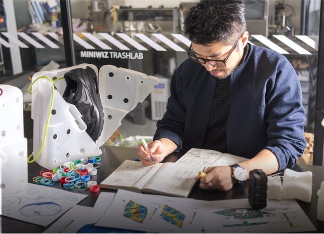 Huangdiseñótenisysuenvoltorioapartirdebasura plástica.