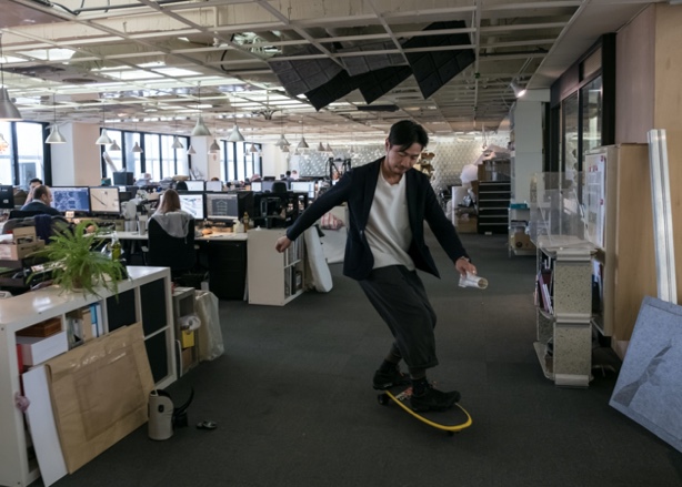 HuangmontasobreunmonopatínfabricadoconmaterialesrecicladosenlaoficinadeMiniwizen Taiwán.