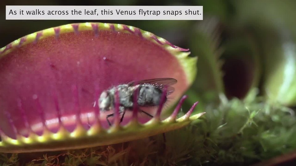 Theplant’sleavesarehingedlikeaclamshell.Insidearestiffhairsthatsensemotion.Whenaninsectmovesacrossonehair,nothinghappens.Butwhenasecondhair istouched,theleafsnapsshut.Theinsectis trapped.