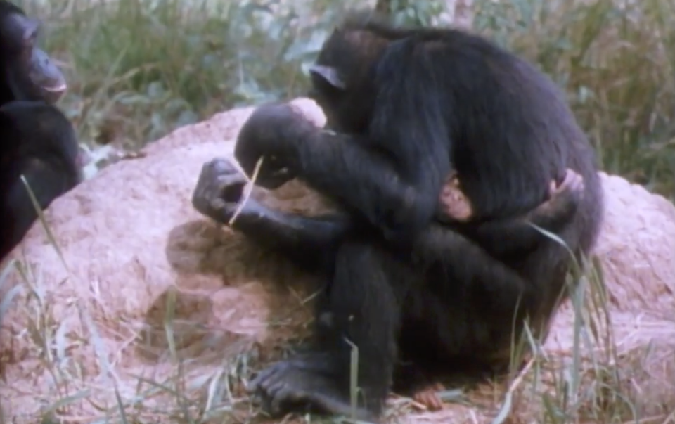 Next,shesawthesamechimpwithabladeofgrass.Hepokeditintoatermitemound.Hepulleditout.Itwascoveredwithtermitesforhimtoeat.Hehadusedthegrassasa tool.