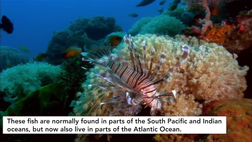 Adiverappears.Heaimsaspeargunatthefish.Hepullsthetriggerandstrikesafish.Thedivershovesthedeadfishintoapouch.Thenhetakesaimatanother lionfish.