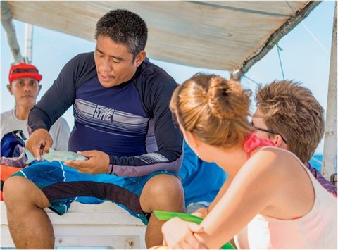 Touristslearnaboutwhalesharksbeforetheyswimwith them.