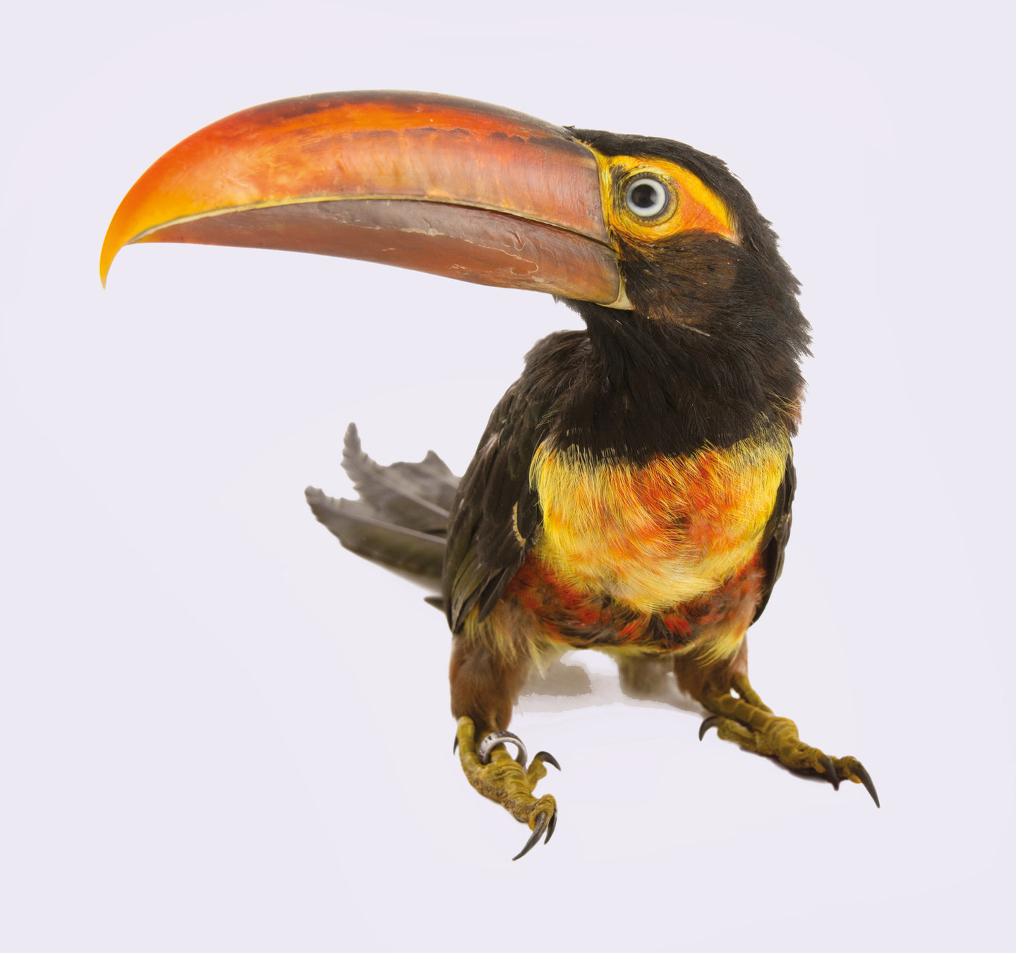 Thefierybilledaracari’ssharpbeakcansliceopenfruit.