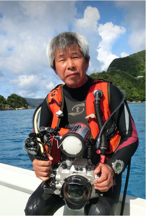 YojiOkatosepusosuequipodebuceo.Agarrósuscámarassubacuáticas.Ysesumergióenlasaguasdelmaralsurde Japón.